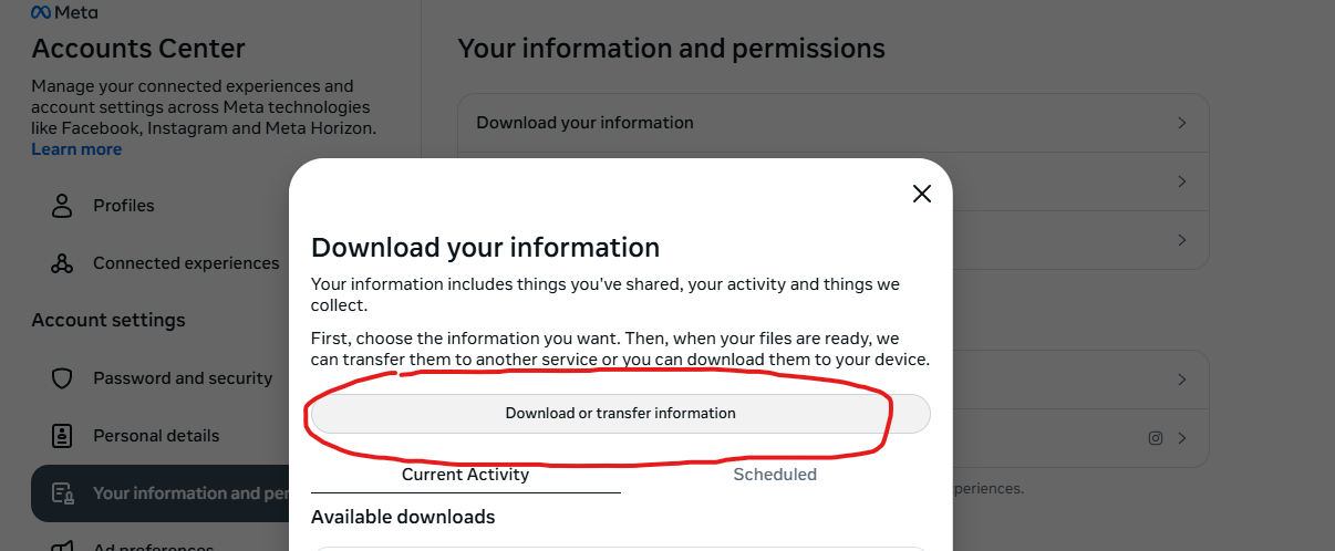 Then navigate to "Your information and permissions" > "Download your information". This will pop up a window. Click on the "Download or transfer information" (See image 2).